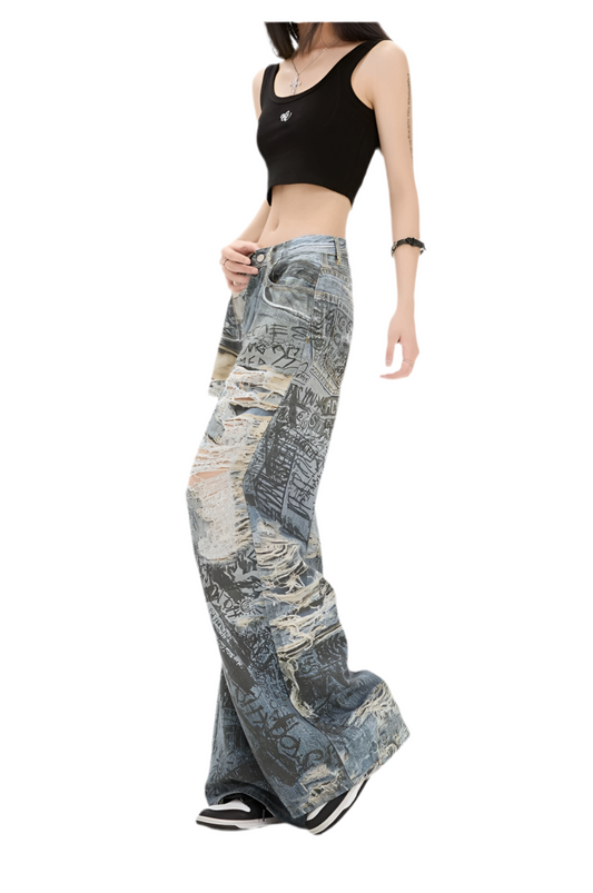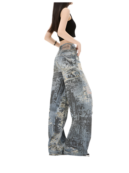 Vintage Blue Rip-Knee Wide Denim Jeans