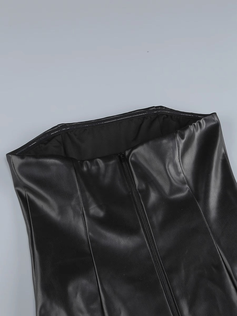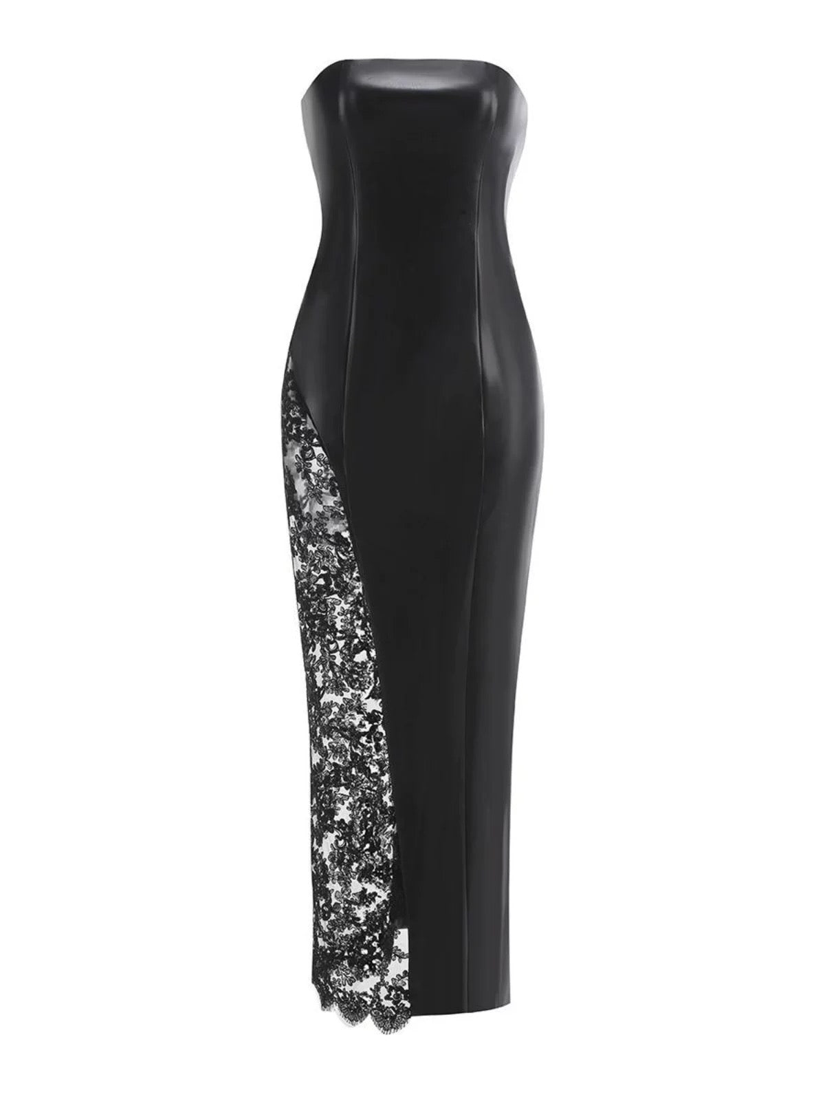 This bold evening gown combines modern edge with timeless glamour. Crafted from smooth faux leather with intricate lace splicing, it sculpts your shape while offering an alluring peek through the leg panel. The strapless bandeau design accentuates the shoulders, while the slim-fit cut creates an elegant silhouette. Ideal for red carpet moments, upscale parties, or black-tie events, this dress is made to make a statement with confidence and class.