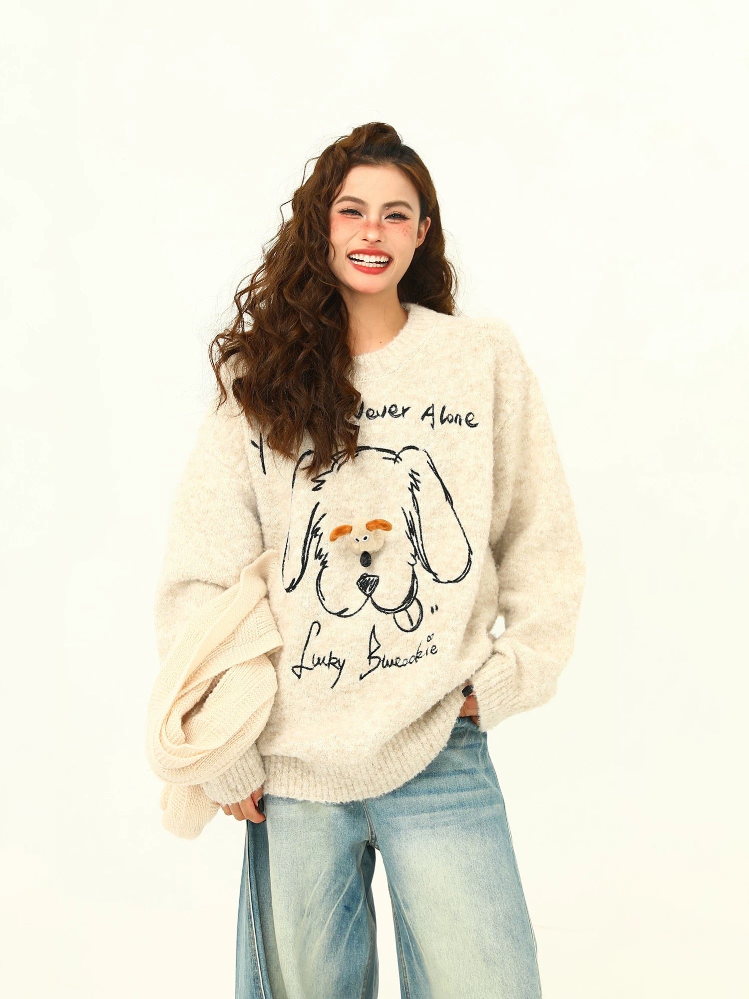 Stay warm and stylish with this playful oversized sweater featuring a charming puppy embroidery that adds personality to your winter wardrobe. Crafted from soft, high-quality knit fabric, it delivers both comfort and durability for chilly days. The relaxed fit and long sleeves make it easy to layer over your favorite jeans or wide-leg pants. Designed for everyday wear, this pullover is perfect for casual outings, coffee runs, or cozy nights in.