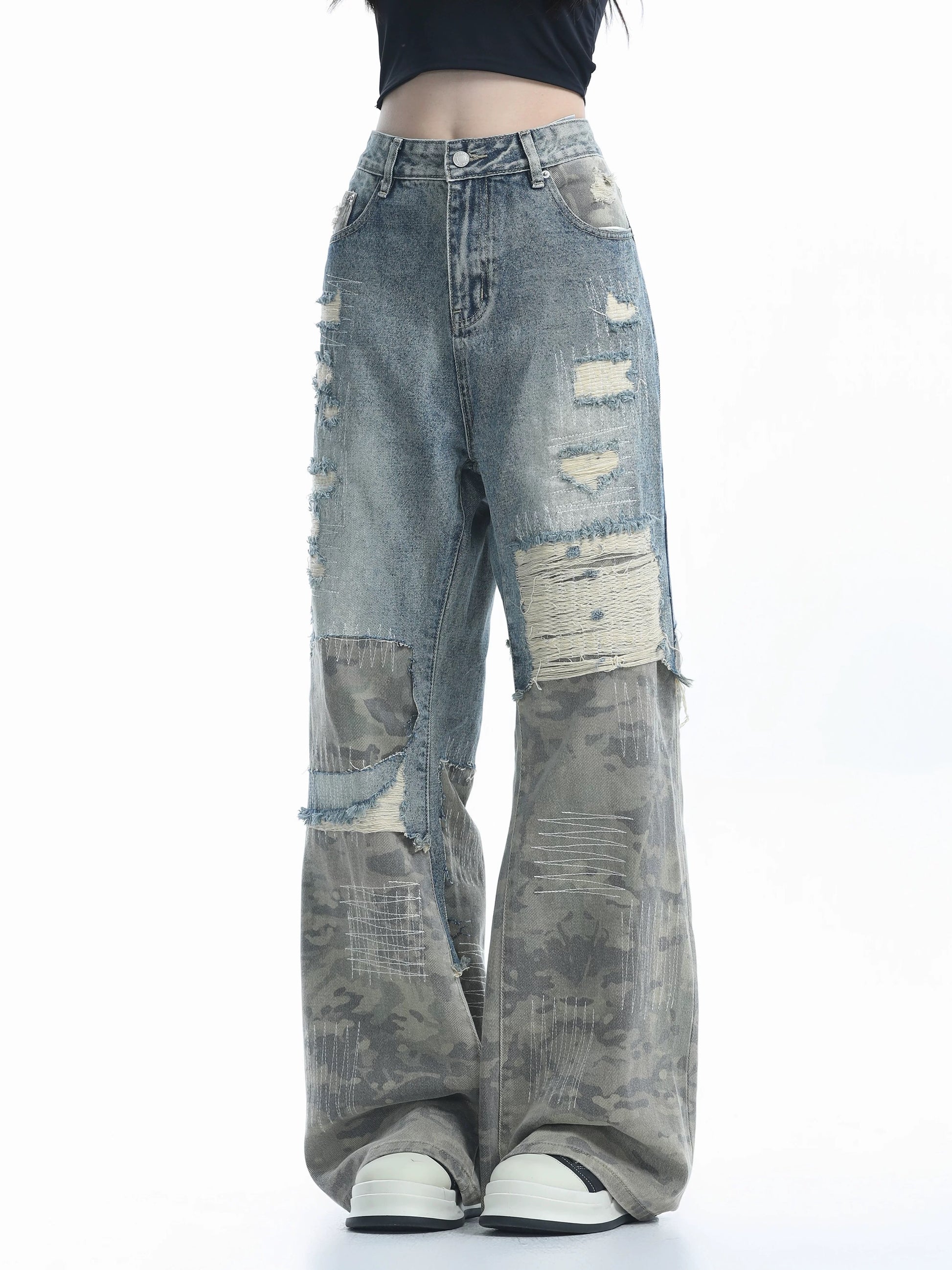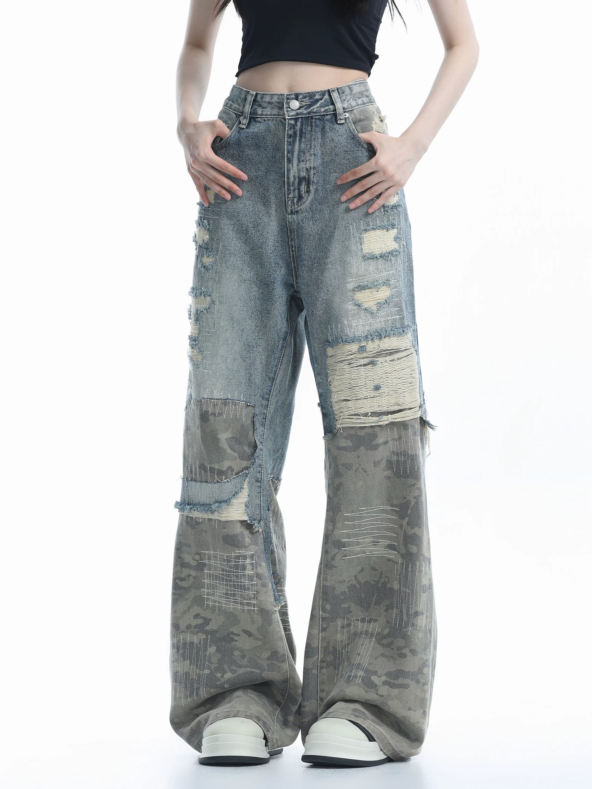 These Edgy Patchwork Wide-Leg Camouflage Jeans blend rugged streetwear style with modern comfort. Crafted from durable denim, the distressed finish and camouflage splicing create a bold, statement-making look. The relaxed wide-leg silhouette offers effortless movement, while the natural waist ensures a flattering fit. Perfect for casual outings or street-style outfits, these jeans are ideal for anyone looking to elevate their wardrobe with a touch of urban edge.