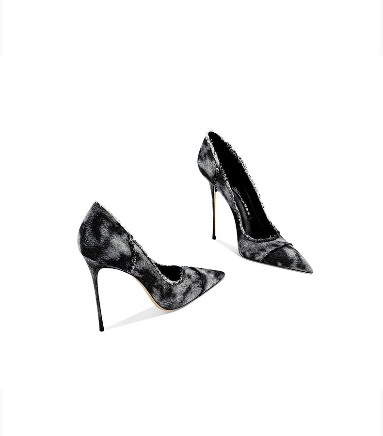 These edgy black denim stiletto pumps are the perfect fusion of casual fabric and high-end design. Featuring a distressed denim upper with raw-cut edging, they add a daring twist to the classic pointed-toe heel. The slim stiletto elevates your look with sleek confidence, while the sheepskin insole ensures all-day comfort. Whether paired with a sharp suit, a little black dress, or even casual denim, these pumps effortlessly transition from daytime boldness to evening glamour. A must-have for women who embrace fearless, fashion-forward style.