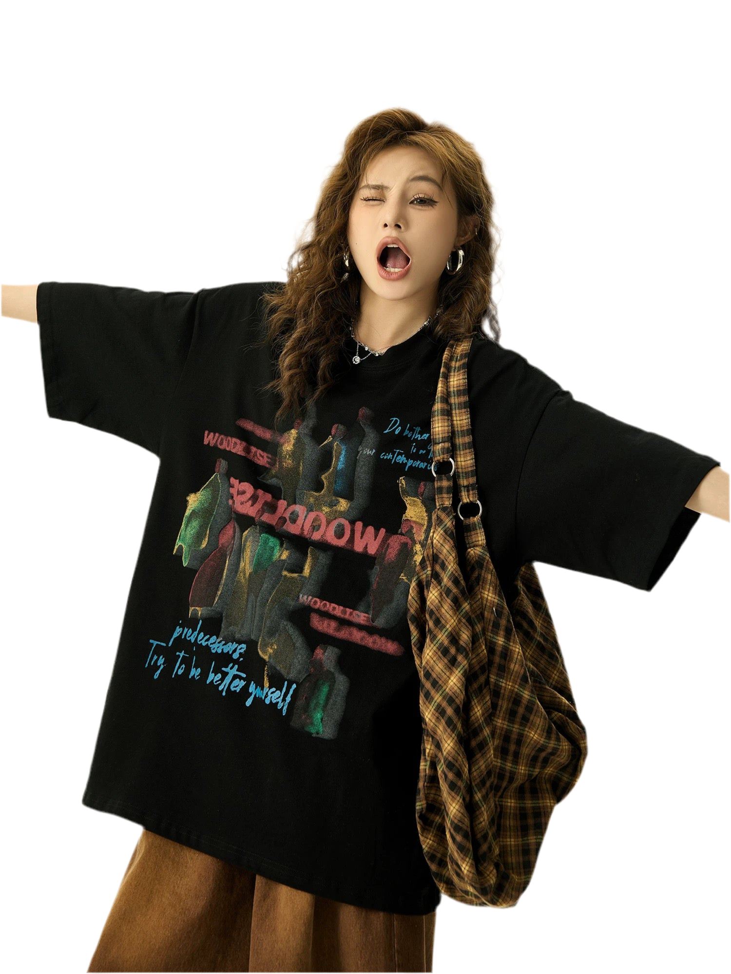 Step into effortless style with this retro graphic oversized streetwear T-shirt, designed for ultimate comfort and trend-forward looks. The vibrant print and relaxed fit make it a versatile choice for casual outings, music festivals, or street style shoots. Made with a breathable cotton blend, it pairs perfectly with jeans, shorts, or layered under jackets for a chic urban vibe.