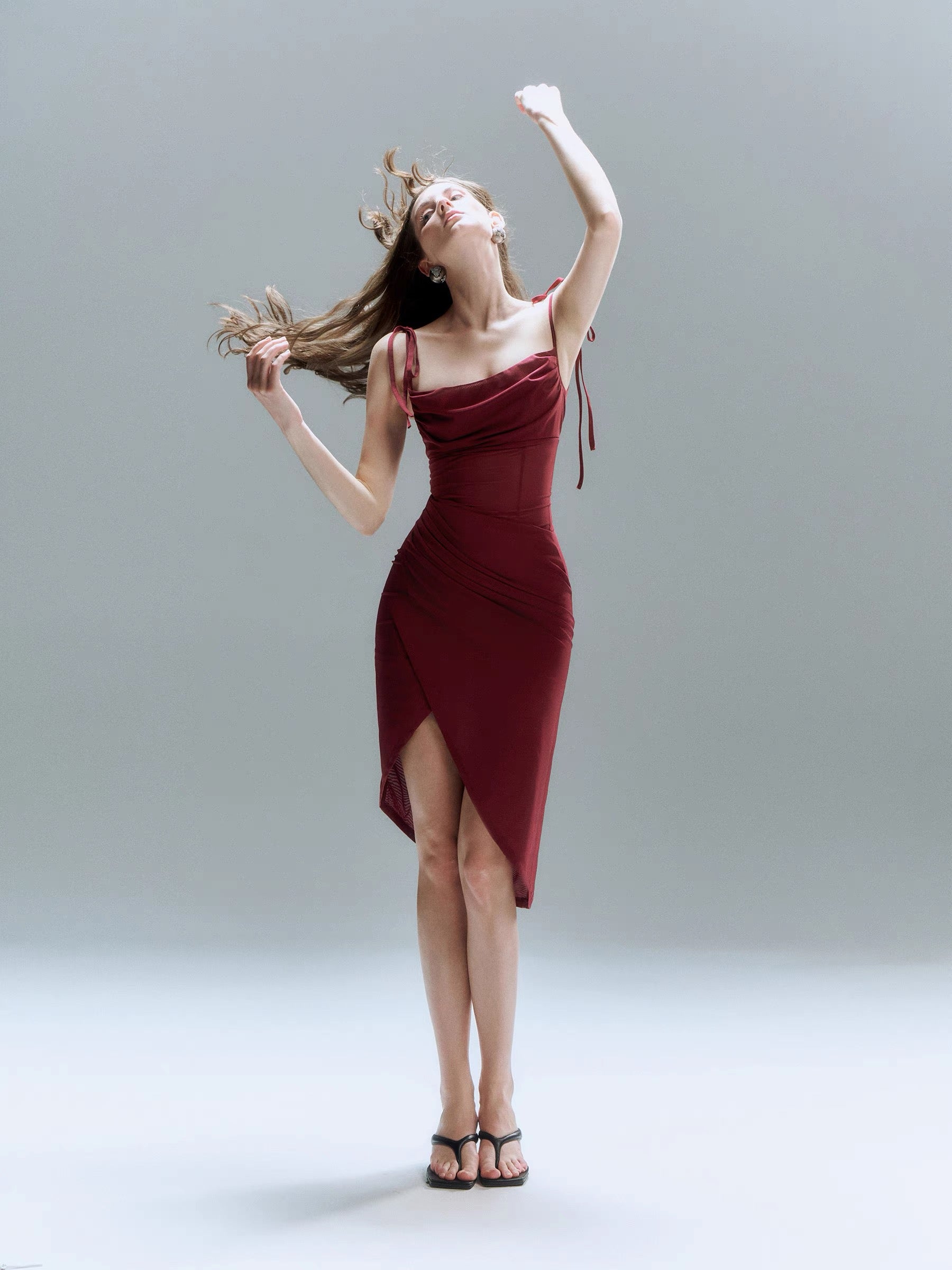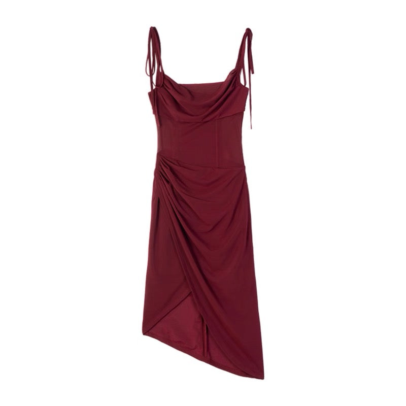Command attention with this sleek burgundy dress, crafted for women who love confident, curve-enhancing styles. The hip-wrapping ruched design flatters your silhouette, while the asymmetrical hem and sultry side slit create dramatic movement. Made from high-quality polyester, this dress hugs in all the right places. Tie-up shoulder straps add a touch of playful elegance. Ideal for cocktail parties, summer dates, or evening occasions where you want to stand out
